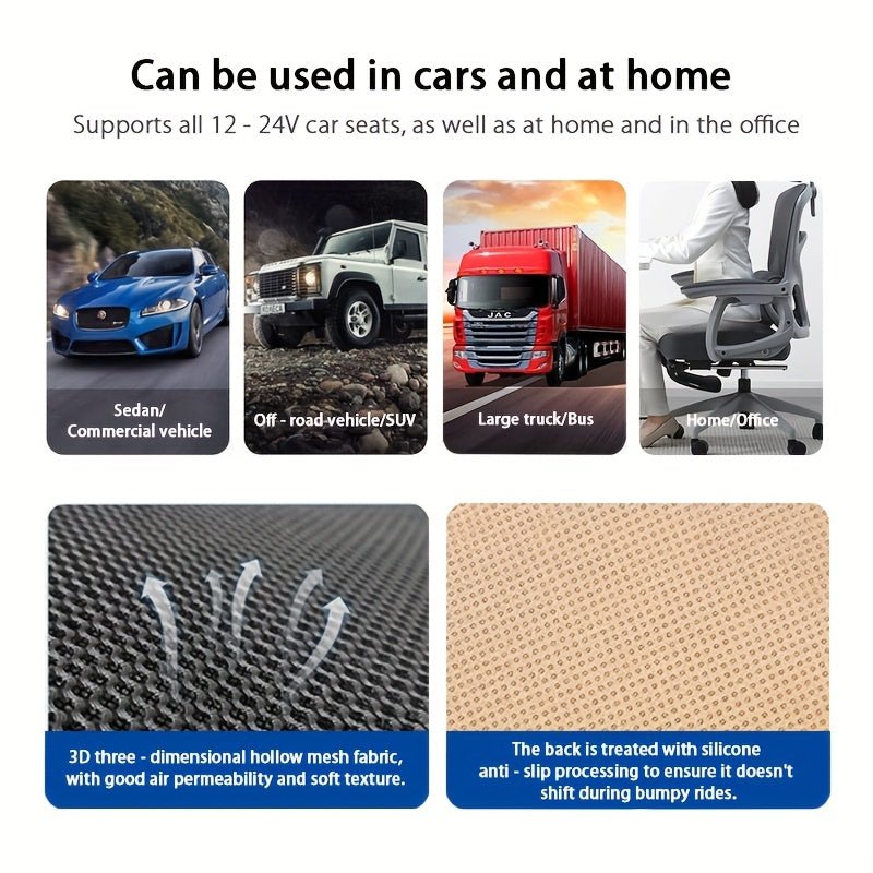 [Premium Cotton] This car ventilated seat cushion features a premium quality cotton surface that offers exceptional breathability and comfort. Unlike typical seat covers, its soft, non-scratchy fabric ensures a pleasant seating experience even during extended drives. Designed to enhance your car’s interior, this cushion provides superior ventilation to reduce heat buildup and moisture, making it a significant upgrade over standard car seats. Its durable construction supports long-lasting use while maintaining a comfortable, cool environment. Ideal for hot weather, this cushion helps you stay fresh and comfortable, transforming your driving experience into one of true relaxation and support.
