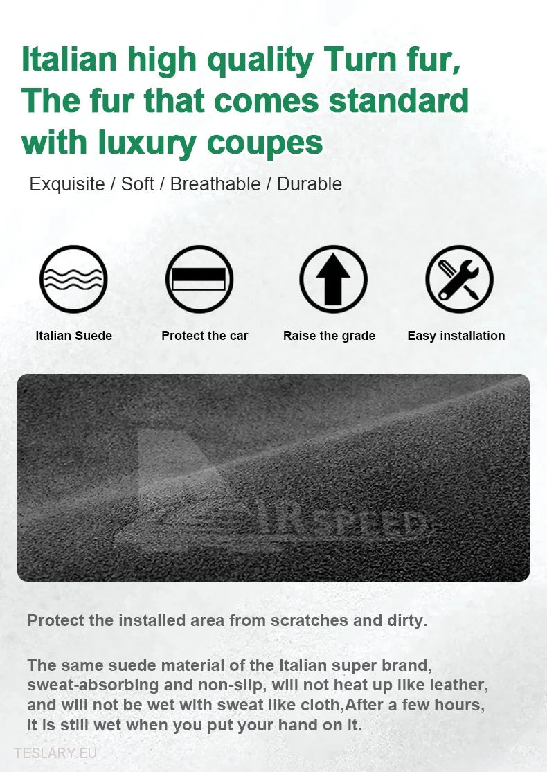 2. These Tesla Model 3 Highland Italian Alcantara suede button covers combine sophisticated design with practical protection. Featuring anti-scratch and abrasion-resistant properties, they effectively shield your vehicle’s buttons from daily wear while maintaining a pristine appearance. The subtle reflective effect adds a touch of elegance, enhancing the overall interior ambiance and elevating your Tesla’s cabin aesthetics. Crafted with precision, these covers not only protect but also enrich the tactile experience, contributing to a refined and durable finish. Ideal for owners who value both style and longevity, they ensure your interior remains as impressive as the day you drove it home.