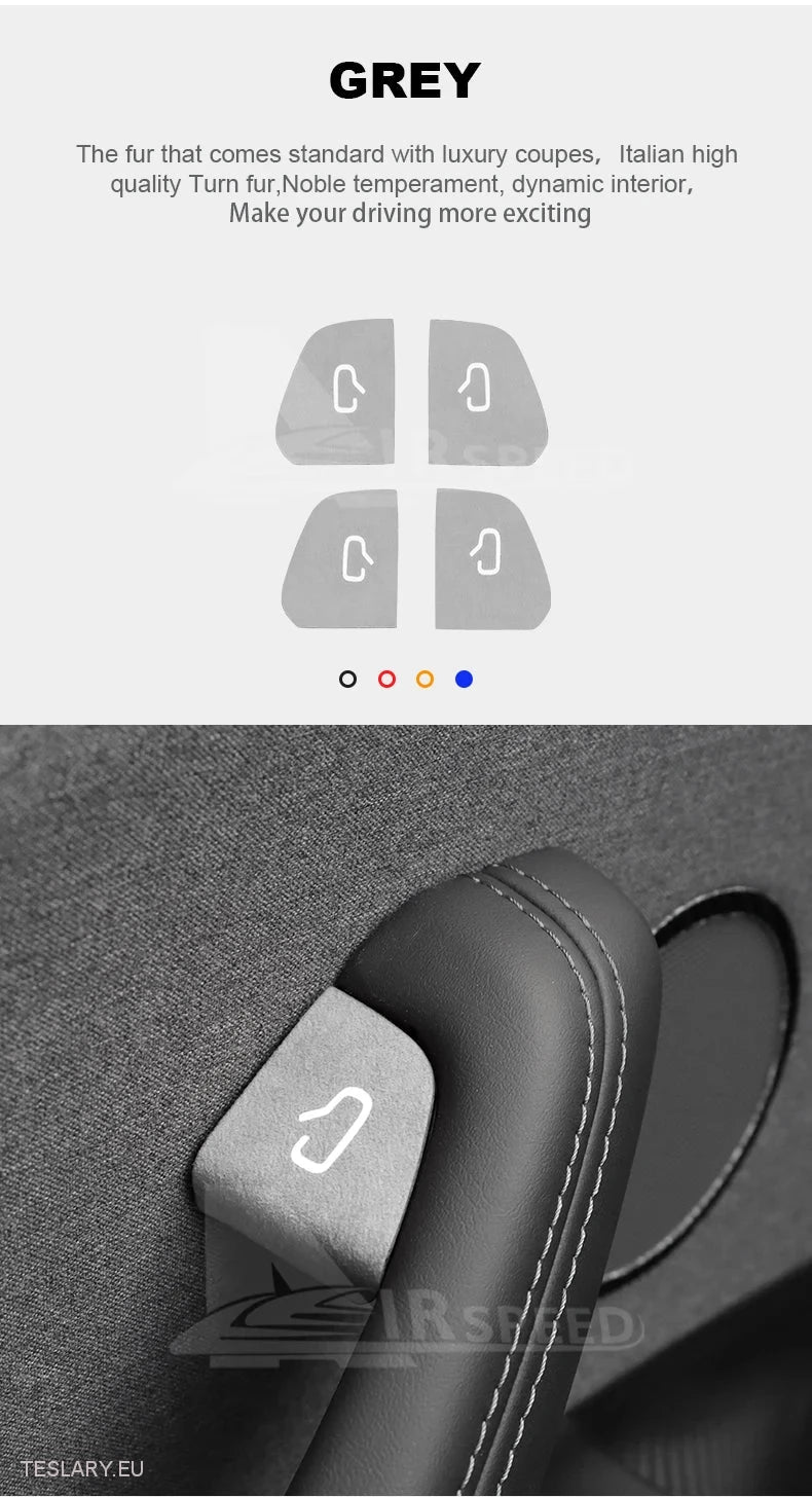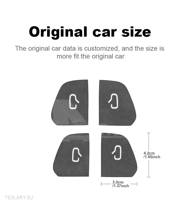 Protect and elevate your Tesla Model 3 Highland and Model Y Juniper interiors with these Italian Alcantara suede button covers, designed specifically for your window and door opening switches. Crafted from high-quality Alcantara, these covers guard against everyday wear and tear while adding a sophisticated, tactile upgrade to your vehicle’s cabin. Installation is quick and effortless, taking less than five minutes, with a precise fit that ensures seamless integration with your Tesla’s design. This expert accessory not only preserves your interior’s pristine condition but also enhances its luxurious appeal, making every drive a refined experience.