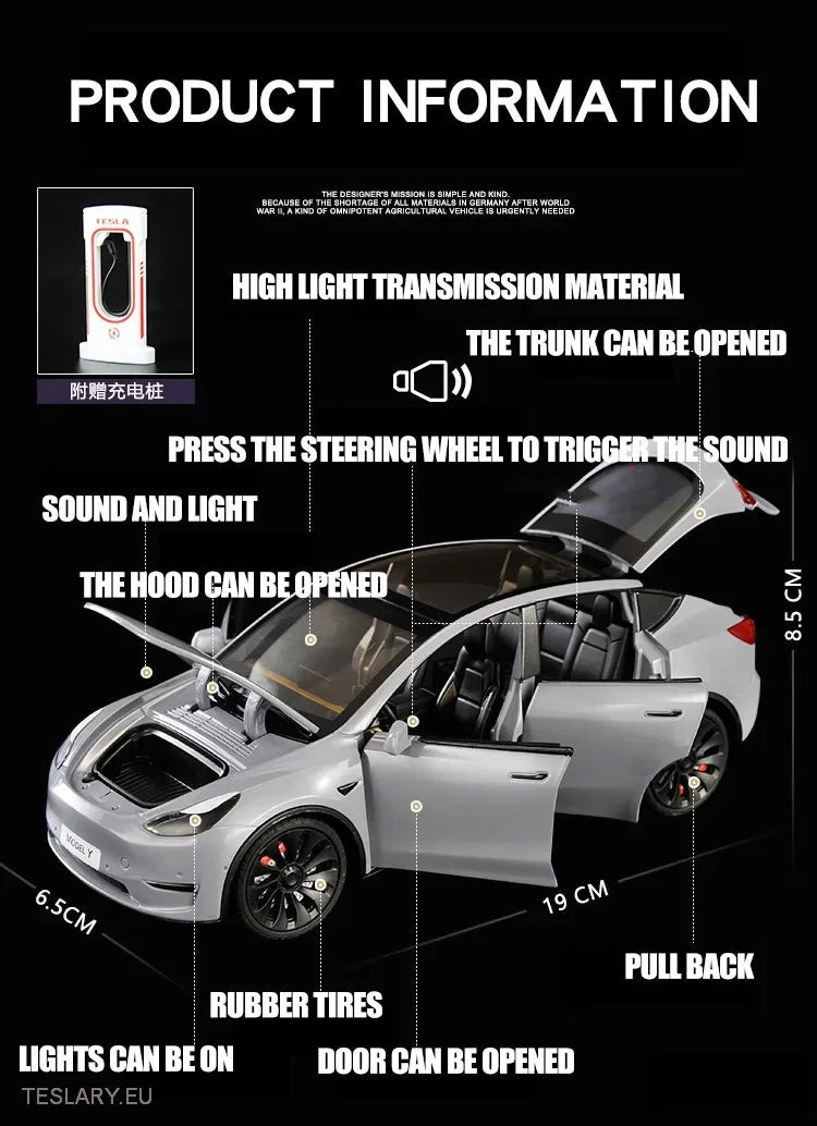 The Scale 1:24 Models are manufactured to the highest standards and have many of the same design elements as the full size Tesla Model Y