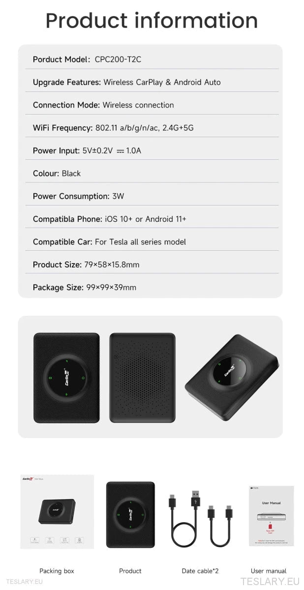 This Wireless Car Play adapter is suitable for Tesla all series models. Through the USB interface of the car, the original car can be upgraded to wireless CarPlay or wireless android auto (for latest version). Provide users with a more convenient driving experience.