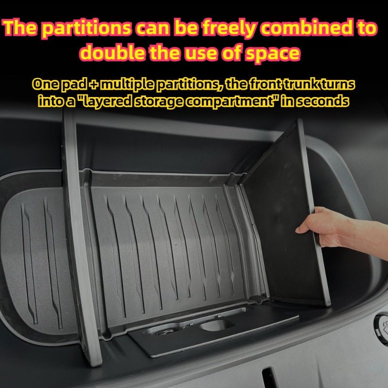 Keep your Tesla Model Y Juniper 2025 trunk neat and organized with these durable, easy-to-clean TPE mats and customizable partitions. They protect against spills and wear while letting you adjust the storage space to fit your needs—whether for large gear or many small items. Quickly transform your front trunk into a layered compartment for better organization and a cleaner look. This upgrade combines practicality with style, making your trunk more functional and impressive.